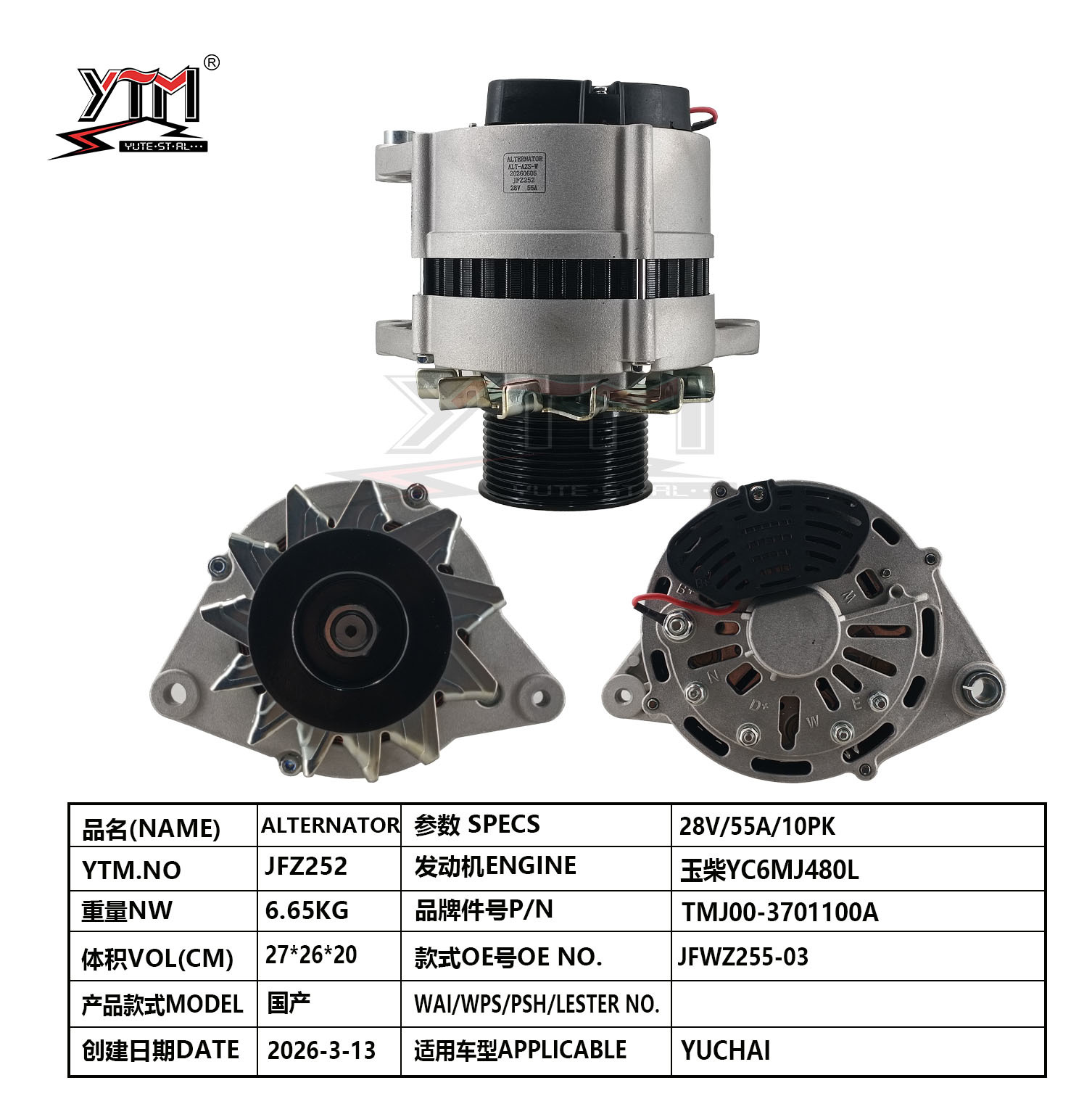 | Выделить: | YUCHAI car alternator 28V 55A,JFWZ255-03 engine alternator,YC6MJ480L electric alternator motor |